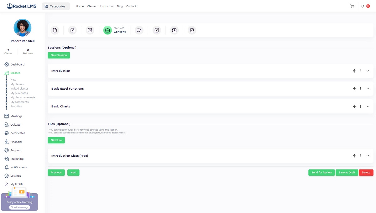 This step is the most important step in the course creation process. All of the course materials like videos, files, projects, live session, assets, circulium, etc will be This steps varies depending to the class type (Live Class, course, text course). We are going to explain different content types that could be defined as course content.