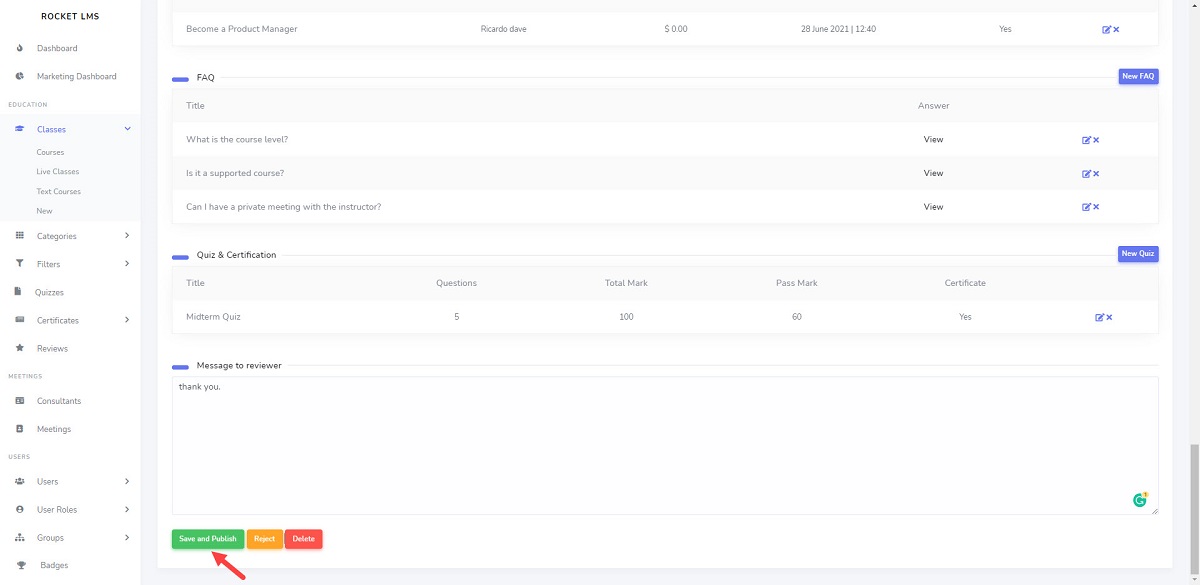 There are several action buttons at the bottom of the page the admin can approve or reject the class.
